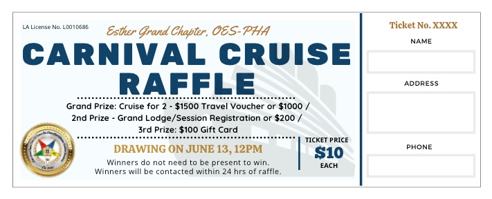 Esther Grand Chapter is hosting a fundraising raffle! Grab your tickets to win one of the three prizes below. Tickets can be purchased from any member. Members can contact your WM or DDGM to obtain tickets.